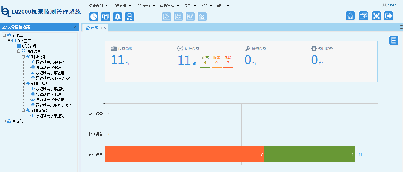 上位機分析軟件具有振動波形頻譜分析、趨勢查詢、報警查詢、設備運行狀態(tài)查詢、設備數(shù)據(jù)統(tǒng)計報告、診斷報告編寫、巡檢計劃編制、設備管理功能。